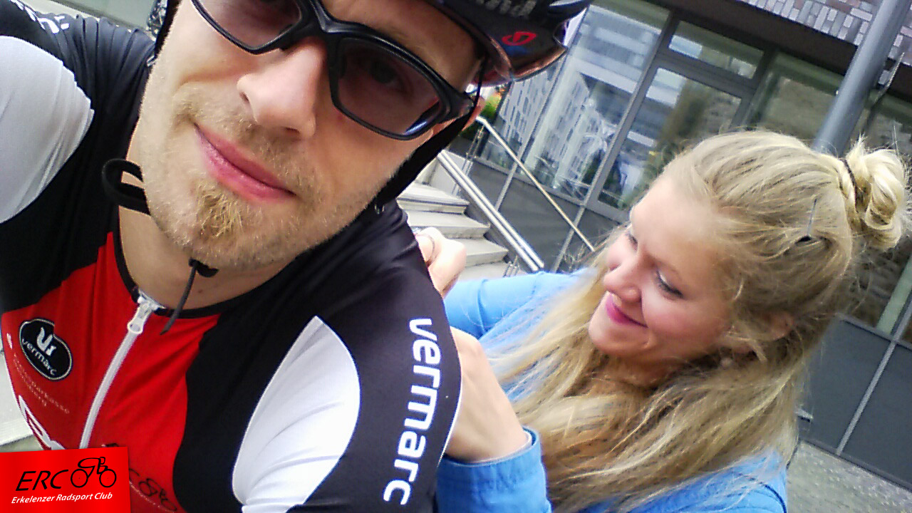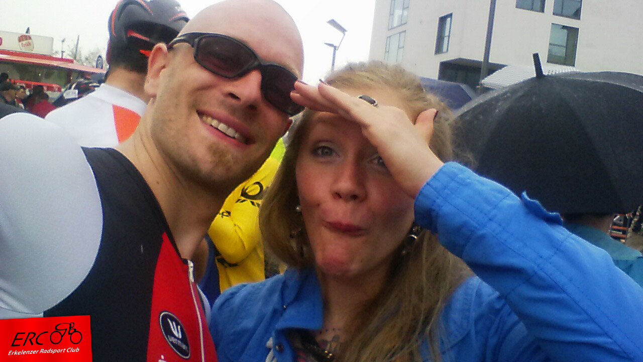 Janet erklärt sich damit einverstanden sich auf einer Bank mit ihrem Unterrichtsvorbereitungsmaterial auszubreiten während ich mich 15 Minuten warm fahren wollte. Ich fuhr zwei Runden und hatte aber dann auch schon das Gefühl, ich sollte mich gleich mal in den Startblock begeben. Die Durchsagen der Moderation versprechen mir: Der Start ist nicht wie im Letzten Jahr am Start/Ziel sondern ausgeschildert. Ich stand also mit vielen anderen im Start-/Zielbereich und konnte ihren Gesichtern ablesen: Die Info war für sie so aussagekräftig wie für mich. Null. Eine kurze Analyse des Menschenstrom bewegte mich dazu, wieder zurückzufahren und ahhhhh, da ist die Startaufstellung. Da ist auch Christof, der in seinem gelben Post-Trikot heller strahlte als die Sonne den gesamten Morgen über. Ich begrüßte ihn und lies mir von ihm letzt Tipps für meinen ersten Start bei einem solchen Massenevent geben, denn ich war ehrlich gesagt zwar auf ein großes Event vorbereitet, aber nicht so ein großes wie, dieses-jenes in welchem ich mich gerade befand. Christof fragt mich auch ob ich Florian, den dritten im Bunde unseres Vereins der hier startet, gesehen hätte. Ich verneinte seine Frage und teilte ihm lediglich mit, dass ich die Fahrer habe ausfahren sehen, aber noch mit meinen körperlichen Befindlichkeiten auf Kriegsfuß stand.