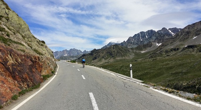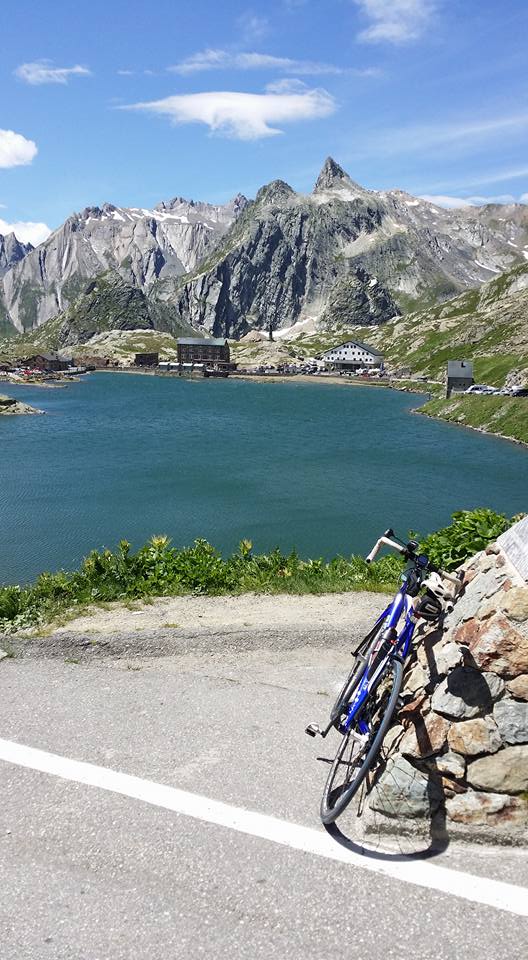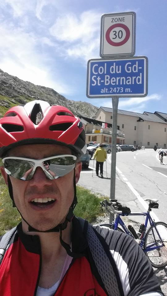 Das besser unter Großer-Sankt-Bernhard-Pass (2469 m) bekannte Bergsträßchen wartete nicht nur mit 28 Kilometern bergauf und über 1400 Höhenmetern auf, sondern hatte noch ein paar Überraschungen in Petto. 1.) Das „Bergsträßchen“ entpuppte sich verkehrstechnisch als leider nur zweispurig ausgebaute Autobahn. Hier gaben sich überholende 40-Tonner, holländische Wohnwagengespanne und 180 km/h fahrende Motorrad-Helldriver quasi die Klinke in die Hand. Alle drei hatten wohl eins gemeinsam: Radfahrer waren ein Störfaktor und wurden gnadenlos mit maximal Halbmeterabständen bekämpft. 2.) Bergauffahren reichte der Natur offenbar nicht. In dem breiten Kerbtal gesellte sich noch Gegenwind im Berg hinzu. Mit meinen Kräften immer noch am Ende, klemmte ich mich hinter eine hübsche Italienerin und ließ deren ansehnliches Hinterteil äh Hinterrad die nächsten 15 Kilometer nicht aus den AugenJ Nachdem die Kohlenhydrate endlich wieder in den Muskeln angekommen waren, revangierte ich mich und setzte mich die letzten 13 Kilometer vor sie und zog sie im Wind den Berg hinauf. Oben am Gipfel gab‘s Shake Hand und wir fuhren wieder unserer Wege. Auf der schönen Passhöhe waren 4200 Höhenmeter und die Hälfte der Strecke geschafft. Meine Laune und Motivation war genau wie der Pass auf dem Höhepunkt.