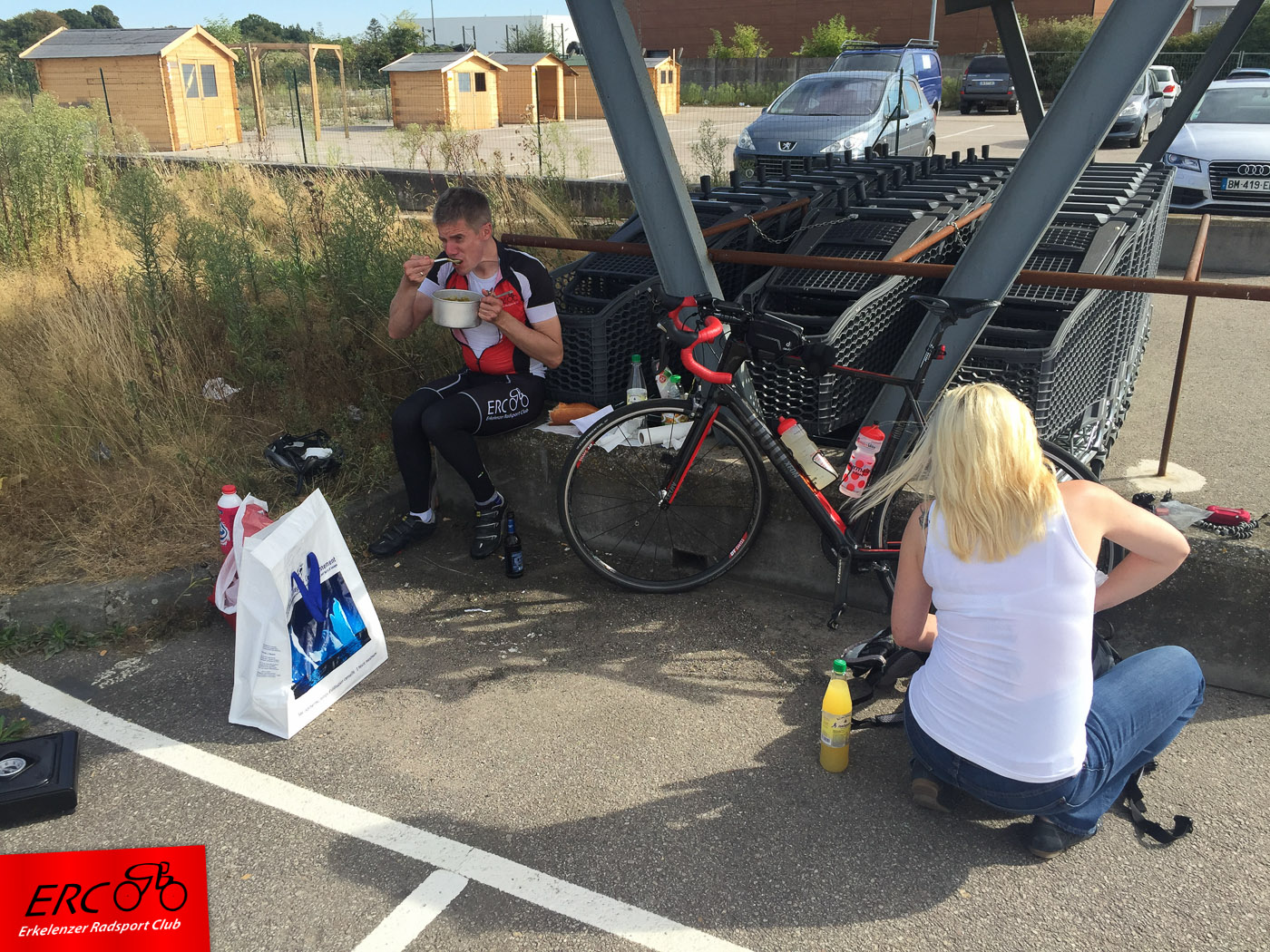 Um kein Verkehrschaos im filigranen oder plumper gesagt übersichtlichen Straßennetz Nordfrankreichs ausbrechen zu lassen, sollten die beiden mir auch nicht auf Schritt und Tritt folgen, sondern mich lediglich alle 3-4 Stunden an genau vorgeplanten Treffpunkten mit einem Radfahrerbuffet empfangen.